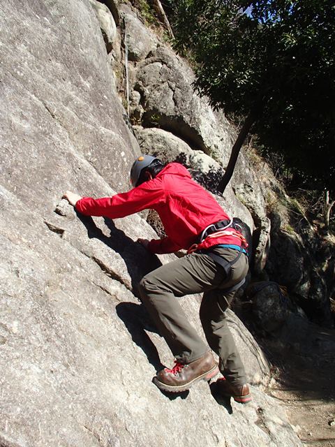 (1)登山靴を履いて、簡単な岩場でのクライミング、クライムダウンの練習。